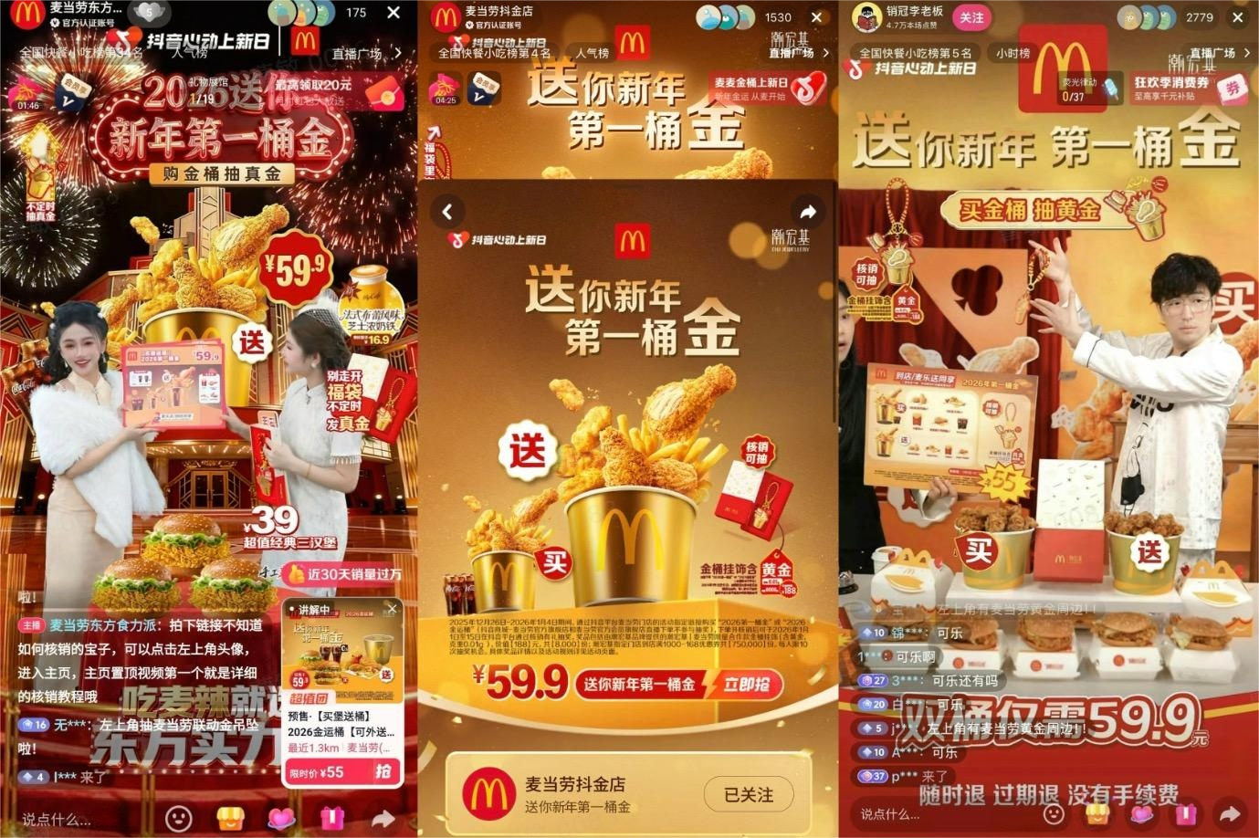 在此次新年大促中,麦当劳特别打造了独具特色的”好运”主题场景,将新年的喜庆与美食的诱惑巧妙融合。主播团队以沉浸式的视觉呈现带领观众感受新年氛围,不仅在镜头前详细解读福利细节,更通过”真金抽奖演示”、”新品试吃互动”等环节,极大增强了直播的趣味性与观众参与感。作为新年的重磅福利,金桶套餐在直播间限时发售,并可在线下门店同步享受,真正实现了”线上线下同享”的用餐体验,精准满足了消费者在新年期间多元化、高品质的用餐需求。